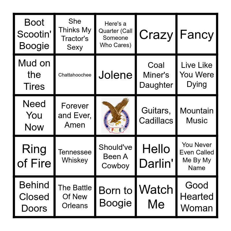 This bingo card has a free space and 56 words: Amarillo By Morning, Behind Closed Doors, Blue, Boot Scootin' Boogie, Born to Boogie, Breathe, Chattahoochee, Check Yes Or No, Coal Miner's Daughter, Country Girl (Shake It For Me), Crazy, Delta Dawn, Don't Take The Girl, East Bound and Down, El Paso, Family Tradition, Fancy, Forever and Ever, Amen, Friends in Low Places, Good Hearted Woman, Guitars, Cadillacs, He Stopped Loving Her Today, Hello Darlin', Here's a Quarter (Call Someone Who Cares), Independence Day, Jolene, Killin' Time, Life is a Highway, Live Like You Were Dying, Lookin' for Love, Mama Tried, Man! I Feel Like A Woman!, Maybe It Was Memphis, Me and Bobby McGee, Mountain Music, Mud on the Tires, Need You Now, Rhinestone Cowboy, Ring of Fire, She Thinks My Tractor's Sexy, Should've Been A Cowboy, Sold (The Grundy County Auction Incident), Stand By Your Man, Take Me Home, Country Roads - Original Version, Take This Job and Shove It, Tennessee Whiskey, The Battle Of New Orleans, The Devil Went Down to Georgia, T-R-O-U-B-L-E, Tulsa Time, Watch Me, Watermelon Crawl, Whiskey River, Who's Your Daddy?, You Never Even Called Me By My Name and Your Cheatin' Heart.