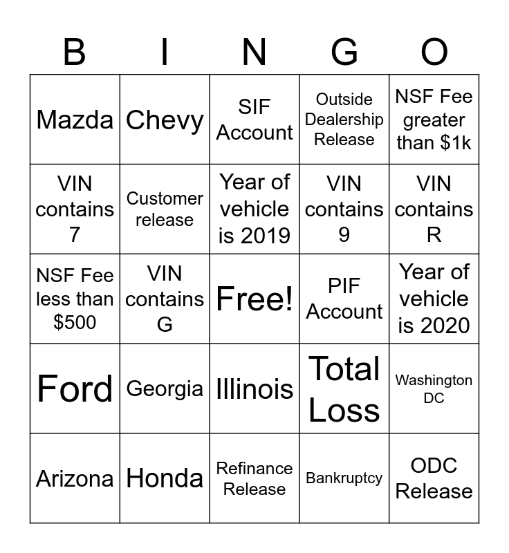 This bingo card has a free space and 34 words: Nebraska, Bankruptcy, VIN contains A, New Mexico, Ford, Customer release, NSF Fee greater than $1k, Arizona, Chevy, Year of vehicle is 2018, Year of vehicle is 2019, SIF Account, Alabama, Charge Off, PIF Account, VIN contains R, Honda, NSF Fee less than $500, Georgia, Total Loss, Illinois, Account work is being done on the backend, Mazda, Year of vehicle is 2020, Refinance Release, ODC Release, Outside Dealership Release, VIN contains 6, VIN contains 9, VIN contains 7, VIN contains J, VIN contains G, Washington DC and Washington.