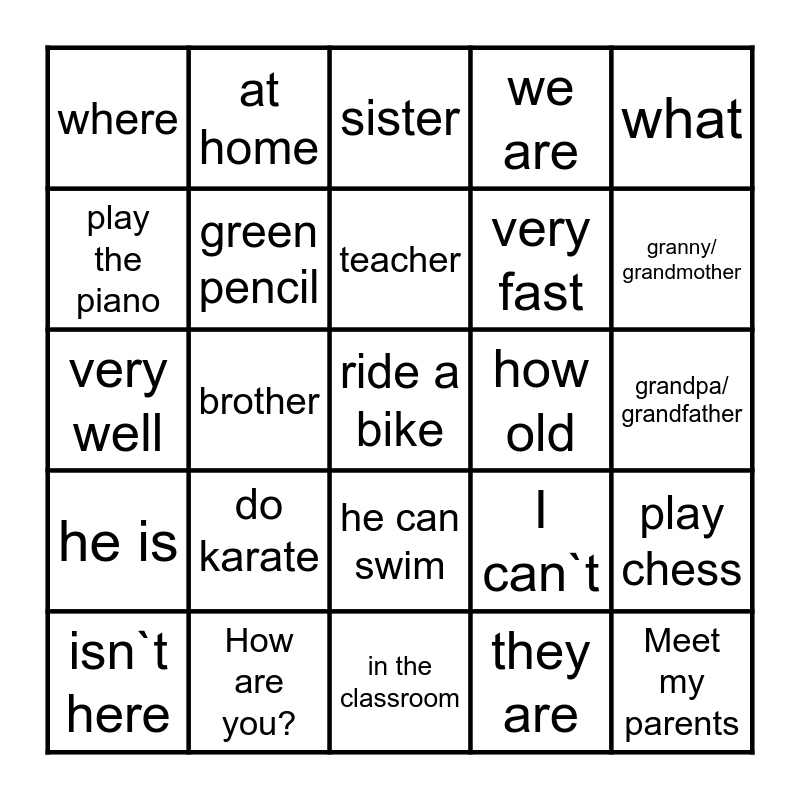 This bingo card has 25 words: do karate, in the classroom, teacher, isn`t here, what, where, play the piano, at home, how old, he can swim, very fast, very well, I can`t, play chess, green pencil, Meet my parents, grandpa/ grandfather, sister, granny/ grandmother, brother, ride a bike, How are you?, he is, we are and they are.