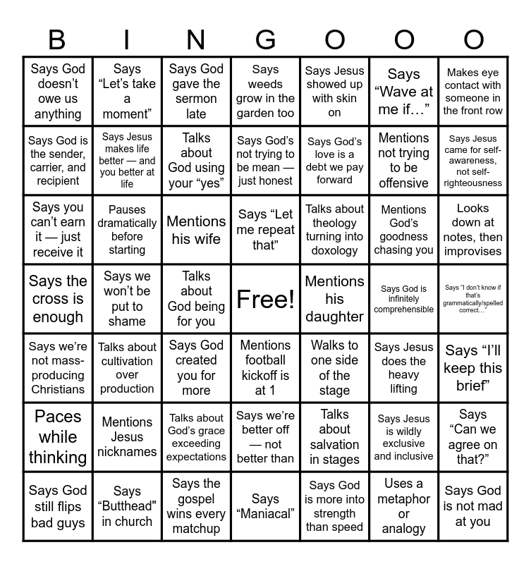 This bingo card has a free space and 100 words: Mentions grace as a gift, not a wage, Talks about salvation in stages, Says you can’t earn it — just receive it, Mentions righteousness by faith, Says grace wrecks pride, Talks about grace drawing us in, Says grace is better than religion, Mentions grace being abundant or overflowing, Says grace plus anything ruins grace, Says grace changes everything, Says grace is the guardrail, Mentions GRACE acronym (God’s Riches At Christ’s Expense), Says the gospel wins every matchup, Says the cross is enough, Talks about fruit vs connection, Says Jesus does the heavy lifting, Says Jesus makes life better — and you better at life, Says Jesus bridges the gap, Says Jesus fulfills the promise, Says Jesus is the sanctuary, Mentions Jesus showing up, Talks about Jesus dying so we can live, Says Jesus is wildly exclusive and inclusive, Says Jesus is the only way, Mentions Jesus nicknames, Says Jesus came for self-awareness, not self-righteousness, Says Jesus showed up with skin on, Talks about theology turning into doxology, Mentions Paul’s glow-up from persecutor to preacher, Talks about spiritual amnesia, Says God’s love is a debt we pay forward, Says God doesn’t owe us anything, Talks about God raising kids, not robots, Says God still flips bad guys, Talks about God being for you, Says God is the sender, carrier, and recipient, Mentions God’s goodness chasing you, Says God meets you where you are, Says God created you for more, Says God is not mad at you, Says God is more into strength than speed, Talks about God’s grace exceeding expectations, Says God’s not trying to be mean — just honest, Says God is infinitely comprehensible, Talks about God using your “yes”, Says God gave the sermon late, Says we’re victors, not victims, Says we’re better off — not better than, Says we belong to the Lord, Says we won’t be put to shame, Says it’s level ground at the cross, Says we’re not mass-producing Christians, Talks about cultivation over production, Says church is a garden, not a factory, Says the goal is influence, not indulgence, Says freedom is saying no, Says love > liberty, Says liberty without love is chaos, Says relationships aren’t efficient — and neither is God, Says weeds grow in the garden too, Says faith is personal, but not private, Says freedom has ripple effects, Says convictions help us stand, Says conformity keeps us silent, Says every generation thinks it’s the last, Says “I’ll end with this…” (but doesn’t), Says “I’m going to keep this short…” (but doesn’t), Says “I don’t know if that’s grammatically/spelled correct…”, Says “I’m not trying to be dramatic…” (but is), Mentions his dad, Mentions his daughter, Mentions his wife, Mentions his son, Mentions being heckled, Says “Maniacal”, Says “Butthead" in church, Talks about toothpaste, Says “Wave at me if…”, Says “Can we agree on that?”, Mentions football kickoff is at 1, Mentions fall activities (football, bonfires, pumpkin spice…), Mentions not trying to be offensive, Says “I wasn’t planning to say this…”, Says “Let me repeat that”, Says “I’ll keep this brief”, Says “Let’s take a moment”, Thanks the audience before actually finishing, Clears throat audibly, Asks “Can everyone hear me?”, Pauses dramatically before starting, Walks to one side of the stage, Uses hands to emphasize a point, Points at the audience, Looks down at notes, then improvises, Makes eye contact with someone in the front row, Laughs at own joke, Uses a metaphor or analogy, Paces while thinking, Refers to information that isn’t visible and Says “Let’s be a church that…”.