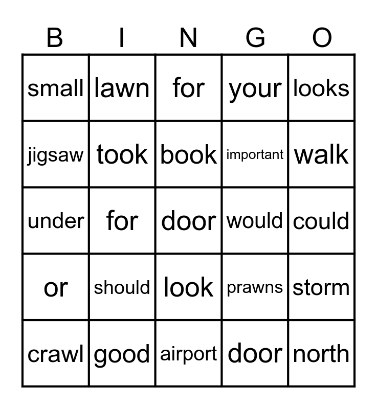 This bingo card has 41 words: Free!, under, butter, took, good, look, book, looking, looks, or, for, your, door, could, would, should, saw, small, torch, for, storm, north, airport, important, transport, fortnight, door, floor, walk, talking, saw, lawn, crawl, prawn, prawns, jigsaw, awful, seesaw, hawk, drawer and launch.