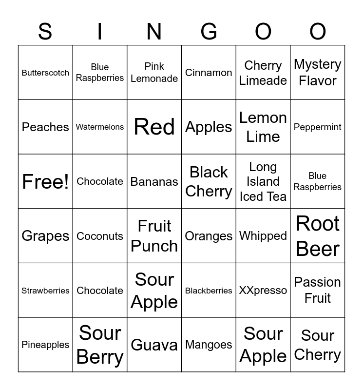 This bingo card has 36 words: Blackberries, Sour Apple, Mangoes, Peaches, Grapes, Black Cherry, Watermelons, Guava, Cherry Limeade, XXpresso, Peppermint, Cinnamon, Passion Fruit, Chocolate, Apples, Butterscotch, Strawberries, Long Island Iced Tea, Free!, Pink Lemonade, Bananas, Coconuts, Oranges, Fruit Punch, Whipped, Blue Raspberries, Lemon Lime, Sour Berry, Red, Mystery Flavor, Sour Cherry, Pineapples, Root Beer, Blue Raspberries, Chocolate and Sour Apple.