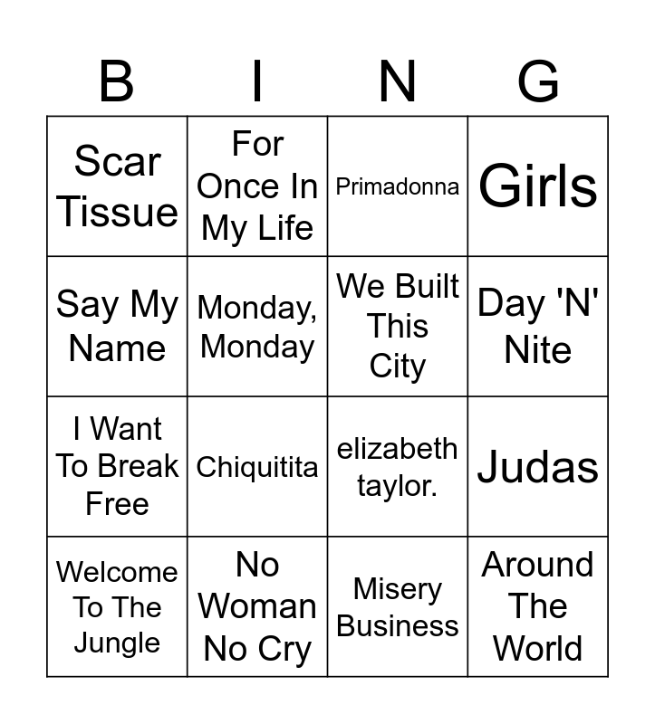 This bingo card has 19 words: elizabeth taylor., Yesterday, Primadonna, Around The World, Judas, Say My Name, Misery Business, Scar Tissue, For Once In My Life, I Want To Break Free, Chiquitita, Monday, Monday, We Built This City, No Woman No Cry, Welcome To The Jungle, No Scrubs, Girls, Day 'N' Nite and Uptown Girl.