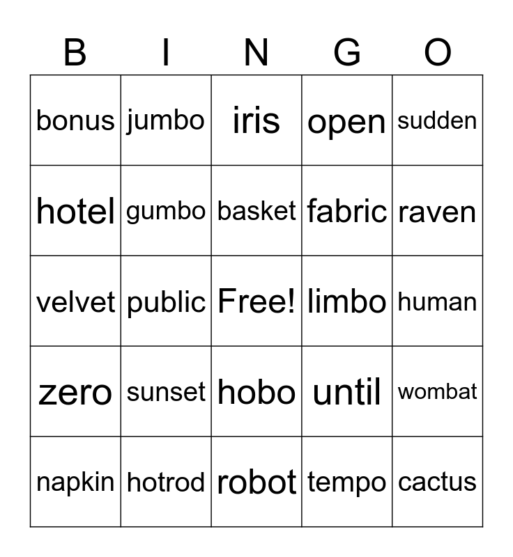 This bingo card has a free space and 24 words: sunset, hotrod, basket, napkin, sudden, bonus, hotel, jumbo, limbo, hobo, fabric, velvet, until, wombat, gumbo, tempo, human, iris, raven, public, cactus, zero, open and robot.