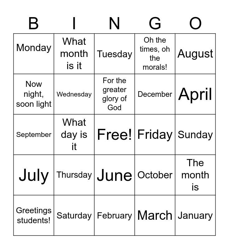 This bingo card has a free space and 29 words: Greetings students!, Greetings teacher!, What day is it, Today is, Monday, Tuesday, Wednesday, Thursday, Friday, Saturday, Sunday, January, February, March, April, May, June, July, August, September, October, November, December, Now night, soon light, Oh the times, oh the morals!, What month is it, The month is, For the greater glory of God and Nothing comes from nothing.