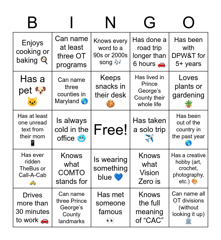 This bingo card has a free space and 24 words: Knows what COMTO stands for, Can name three Prince Georgeβs County landmarks, Keeps snacks in their desk πͺ, Drives more than 30 minutes to work π, Has been with DPW&T for 5+ years, Enjoys cooking or baking π³, Has a pet πΆπ±, Can name at least three OT programs, Has taken a solo trip βοΈ, Is wearing something blue π, Has lived in Prince Georgeβs County their whole life, Has at least one unread text from their mom π±, Knows what Vision Zero is, Has a creative hobby (art, crochet, photography, etc.) π¨, Can name three counties in Maryland π, Knows the full meaning of βCACβ, Has been out of the country in the past year π, Knows every word to a 90s or 2000s song πΆ, Loves plants or gardening πͺ΄, Is always cold in the office π₯Ά, Can name all OT divisions (without looking it up) ποΈ, Has ever ridden TheBus or Call-A-Cab π, Has done a road trip longer than 6 hours π and Has met someone famous π.
