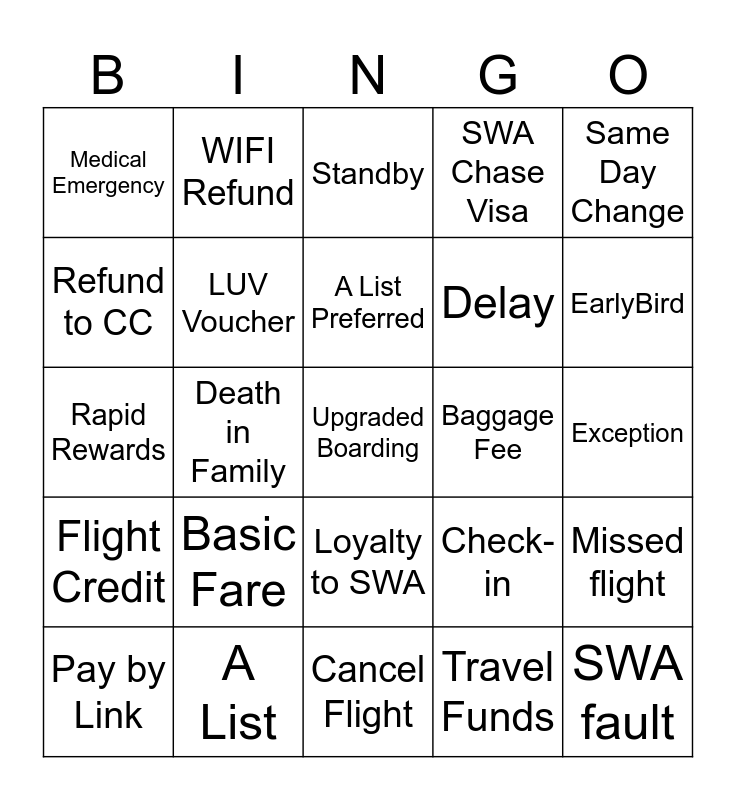 This bingo card has 25 words: Basic Fare, Cancel Flight, A List Preferred, Pay by Link, Same Day Change, Medical Emergency, Refund to CC, WIFI Refund, Baggage Fee, Loyalty to SWA, Delay, Rapid Rewards, Check-in, Missed flight, LUV Voucher, SWA fault, Exception, Standby, EarlyBird, Death in Family, Upgraded Boarding, A List, Flight Credit, SWA Chase Visa and Travel Funds.