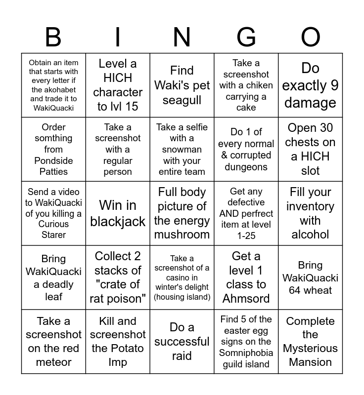 This bingo card has 25 words: Collect 2 stacks of "crate of rat poison", Do a successful raid, Take a selfie with a snowman with your entire team, Take a screenshot on the red meteor, Do exactly 9 damage, Obtain an item that starts with every letter if the akohabet and trade it to WakiQuacki, Order somthing from Pondside Patties, Level a HICH character to lvl 15, Get any defective AND perfrect item at level 1-25, Take a screenshot of a casino in winter's delight (housing island), Do 1 of every normal & corrupted dungeons, Send a video to WakiQuacki of you killing a Curious Starer, Get a level 1 class to Ahmsord, Bring WakiQuacki 64 wheat, Take a screenshot with a regular person, Complete the Mysterious Mansion, Fill your inventory with alcohol, Find Waki's pet seagull, Open 30 chests on a HICH slot, Win in blackjack, Full body picture of the energy mushroom, Kill and screenshot the Potato Imp, Bring WakiQuacki a deadly leaf, Take a screenshot with a chiken carrying a cake and Find 5 of the easter egg signs on the Somniphobia guild island.