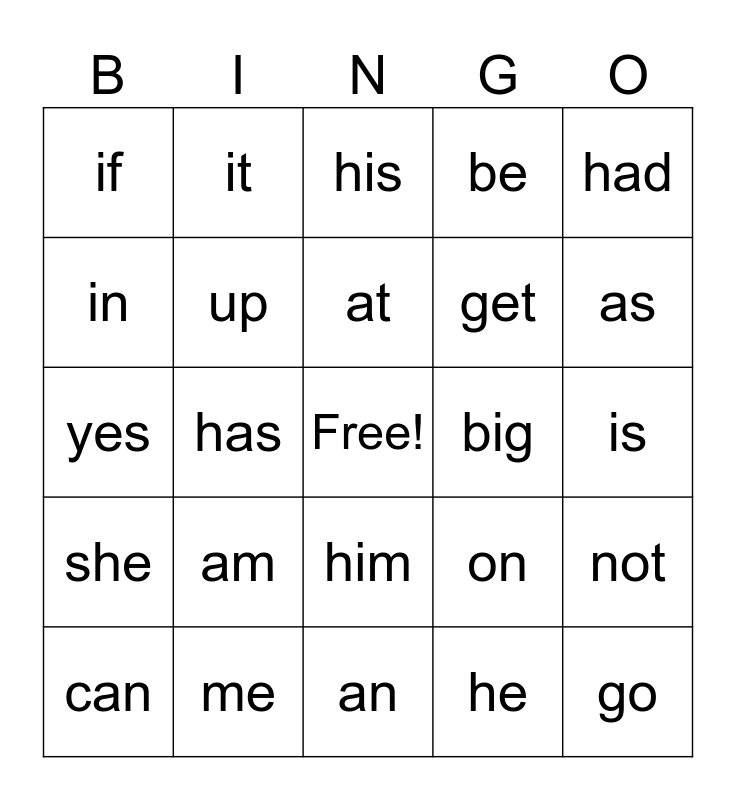This bingo card has a free space and 25 words: am, an, at, can, had, if, in, it, big, him, get, yes, on, not, up, fun, is, his, as, has, go, me, she, be and he.