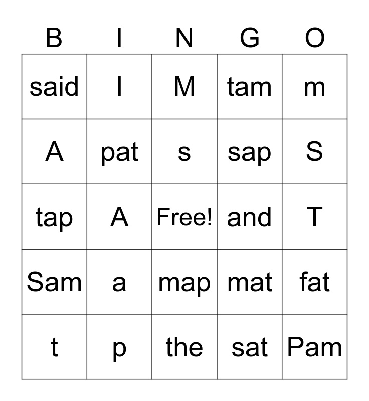 This bingo card has a free space and 24 words: a, p, s, t, m, said, A, I, and, map, sap, tap, mat, fat, pat, sat, T, M, S, A, Pam, Sam, tam and the.