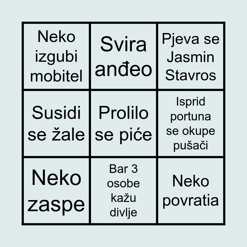 This bingo card has a free space and 14 words: Pukla čaša, Neko slika BeReal, Neko zaspe, Svira anđeo, Susidi se žale, Neko povratia, Neko kasni više od 2h, Neko snimi Tik Tok, Bar 3 osobe kažu divlje, Neko izgubi mobitel, Bar 5 ljudi pije shot istovremeno, Isprid portuna se okupe pušači, Pjeva se Jasmin Stavros and Igra se bus.