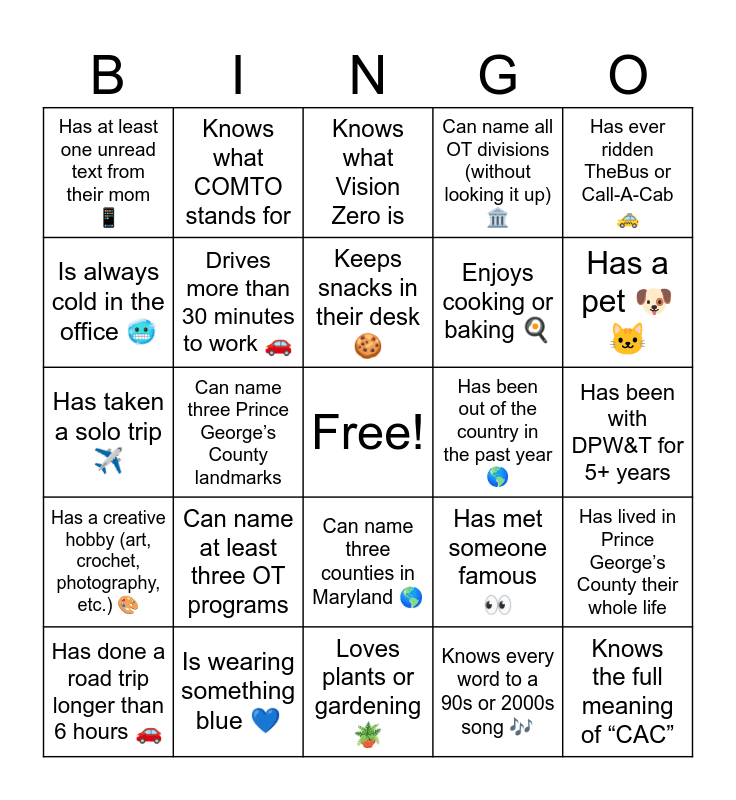 This bingo card has a free space and 24 words: Can name at least three OT programs, Is wearing something blue π, Keeps snacks in their desk πͺ, Has done a road trip longer than 6 hours π, Has ever ridden TheBus or Call-A-Cab π, Has at least one unread text from their mom π±, Is always cold in the office π₯Ά, Knows what COMTO stands for, Has been out of the country in the past year π, Can name three counties in Maryland π, Enjoys cooking or baking π³, Has taken a solo trip βοΈ, Has met someone famous π, Has lived in Prince Georgeβs County their whole life, Drives more than 30 minutes to work π, Knows every word to a 90s or 2000s song πΆ, Has been with DPW&T for 5+ years, Knows what Vision Zero is, Has a pet πΆπ±, Can name three Prince Georgeβs County landmarks, Knows the full meaning of βCACβ, Has a creative hobby (art, crochet, photography, etc.) π¨, Can name all OT divisions (without looking it up) ποΈ and Loves plants or gardening πͺ΄.