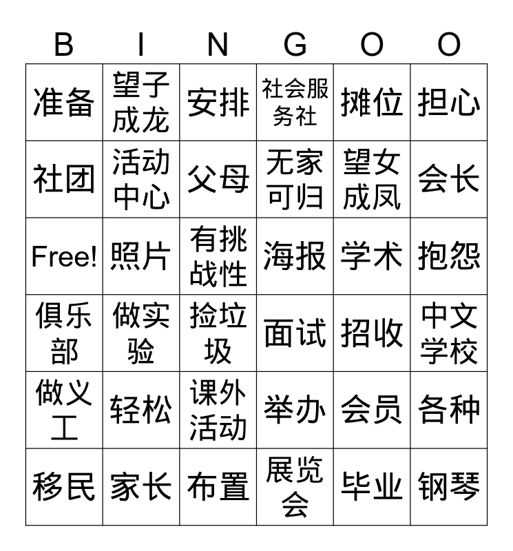 This bingo card has 36 words: 举办, 课外活动, 展览会, 社团, 俱乐部, 海报, 活动中心, 布置, 摊位, 会员, 会长, 社会服务社, 各种, 照片, 无家可归, 准备, 做义工, 学术, Free!, 安排, 有挑战性, 做实验, 面试, 捡垃圾, 招收, 望子成龙, 望女成凤, 家长, 父母, 担心, 钢琴, 移民, 中文学校, 抱怨, 轻松 and 毕业.