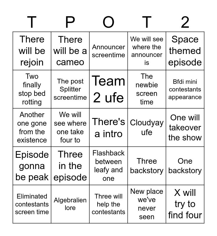 This bingo card has a free space and 24 words: Three in the episode, Algebralien lore, Team 2 ufe, Eliminated contestants screen time, Space themed episode, There will be rejoin, Two finally stop bed rotting, There will be a cameo, Cloudyay ufe, Flashback between leafy and one, The newbie screen time, Another one gone from the existence, Three backstory, One backstory, The post Splitter screentime, New place we've never seen, One will takeover the show, Announcer screentime, Bfdi mini contestants appearance, We will see where one take four to, X will try to find four, Episode gonna be peak, We will see where the announcer is and Three will help the contestants.