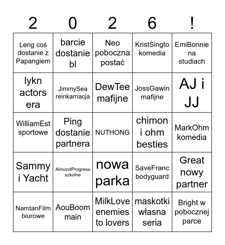 This bingo card has a free space and 24 words: AlmondProgress szkolne, AouBoom main, DewTee mafijne, NamtanFilm biurowe, EmiBonnie na studiach, Leng coś dostanie z Papangiem, lykn actors era, barcie dostanie bl, chimon i ohm besties, nowa parka, JossGawin mafijne, WilliamEst sportowe, SaveFranc bodyguard, Great nowy partner, JimmySea reinkarnacja, maskotki własna seria, MarkOhm komedia, Neo poboczna postać, AJ i JJ, Ping dostanie partnera, Bright w pobocznej parce, Sammy i Yacht, KristSingto komedia and MilkLove enemies to lovers.