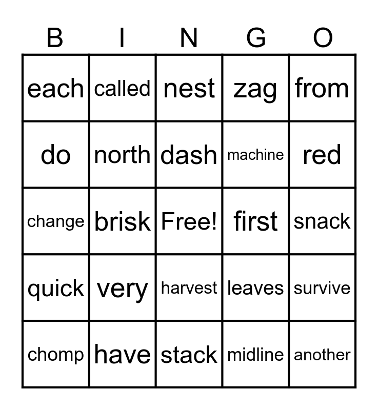 This bingo card has a free space and 24 words: very, have, dash, chomp, from, each, do, called, first, harvest, machine, change, leaves, survive, north, midline, snack, nest, red, brisk, another, quick, zag and stack.