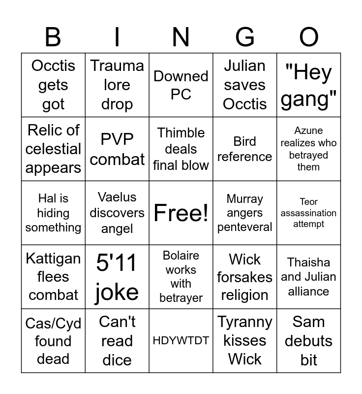 This bingo card has a free space and 24 words: 5'11 joke, Can't read dice, Thimble deals final blow, Cas/Cyd found dead, "Hey gang", Occtis gets got, Relic of celestial appears, Trauma lore drop, Murray angers penteveral, Bolaire works with betrayer, Bird reference, Hal is hiding something, Wick forsakes religion, Thaisha and Julian alliance, PVP combat, Tyranny kisses Wick, Teor assassination attempt, Downed PC, Azune realizes who betrayed them, Vaelus discovers angel, Sam debuts bit, Kattigan flees combat, Julian saves Occtis and HDYWTDT.