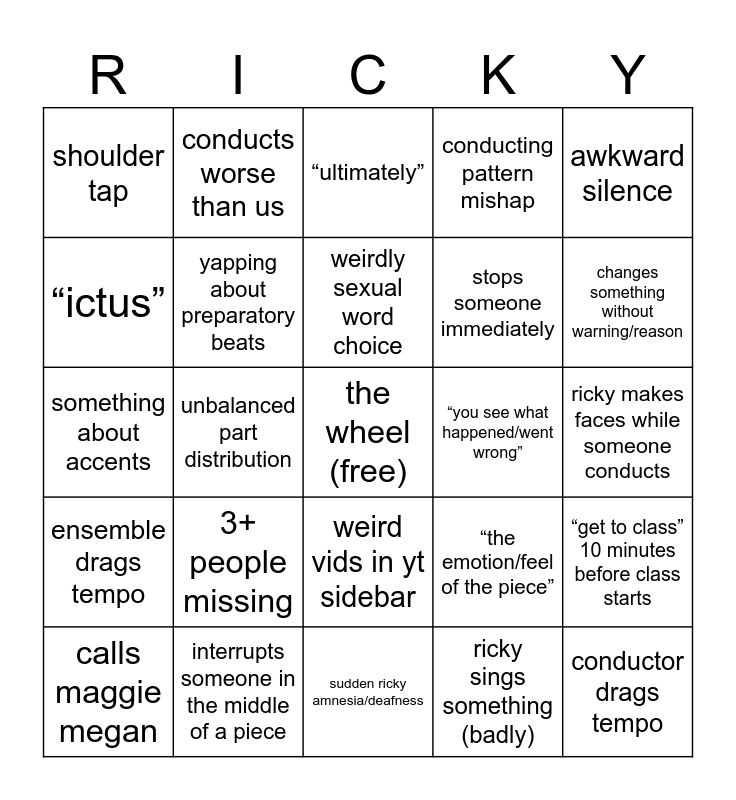 This bingo card has a free space and 24 words: 3+ people missing, interrupts someone in the middle of a piece, weirdly sexual word choice, calls maggie megan, awkward silence, shoulder tap, “ictus”, conducts worse than us, “you see what happened/went wrong”, weird vids in yt sidebar, stops someone immediately, something about accents, “the emotion/feel of the piece”, “get to class” 10 minutes before class starts, yapping about preparatory beats, ricky sings something (badly), ricky makes faces while someone conducts, “ultimately”, changes something without warning/reason, unbalanced part distribution, conductor drags tempo, ensemble drags tempo, conducting pattern mishap and sudden ricky amnesia/deafness.