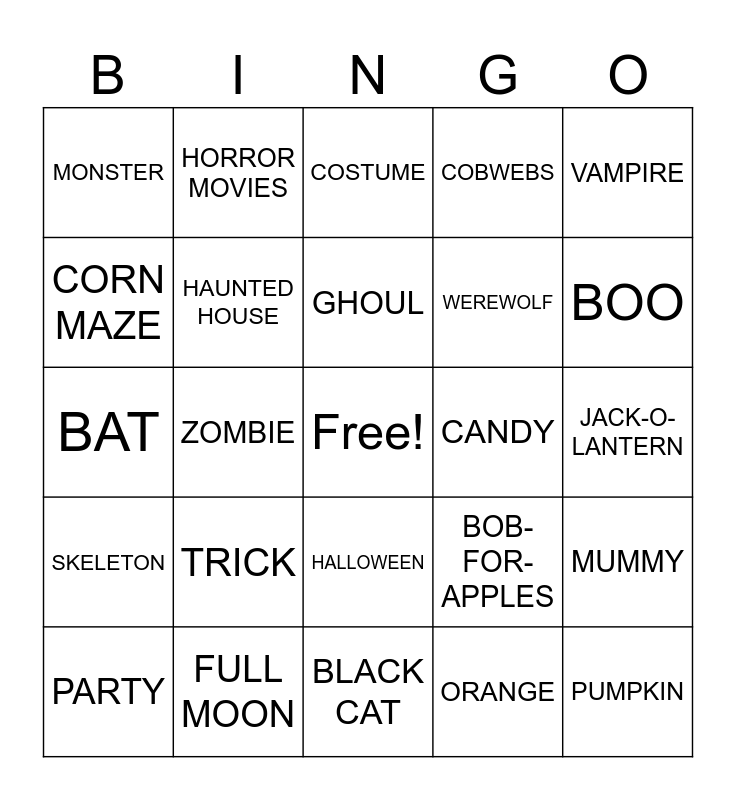 This bingo card has a free space and 41 words: WITCH, BAT, GHOST, HAUNTED HOUSE, FULL MOON, HALLOWEEN, GHOUL, GOBLIN, VAMPIRE, SKELETON, ZOMBIE, COBWEBS, PUMPKIN, JACK-O-LANTERN, CANDY, TRICK, TREAT, MONSTER, MASK, COSTUME, MUMMY, GRAVEYARD, BLACK CAT, WEREWOLF, WIZARD, BLACK, ORANGE, SCARY, BOO, MAGIC, OCTOBER, HORROR MOVIES, PARTY, CARAMEL APPLE, BOB-FOR-APPLES, CORN MAZE, OUIJA BOARD, HAYRIDE, CAULDRON, POTION and CRYSTAL BALL.