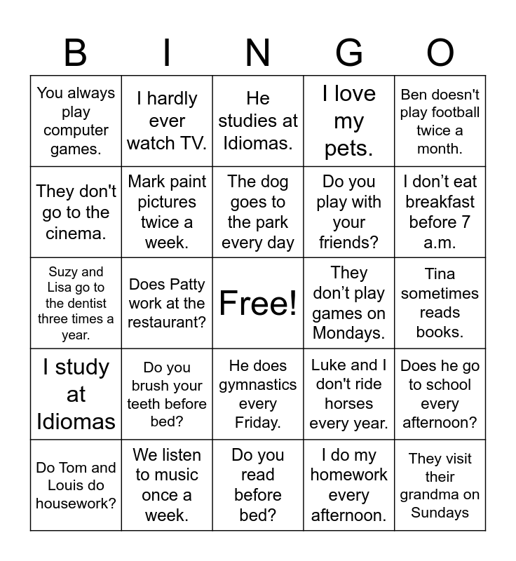 This bingo card has a free space and 26 words: He does gymnastics every Friday., I do my homework every afternoon., The dog goes to the park every day, We listen to music once a week., Ben doesn't play football twice a month., You always play computer games., They don't go to the cinema., I hardly ever watch TV., Tina sometimes reads books., Luke and I don't ride horses every year., Do you play with your friends?, Suzy and Lisa go to the dentist three times a year., Does he go to school every afternoon?, Do Tom and Louis do housework?, Does Patty work at the restaurant?, I don’t like pizza., I love my pets., I study at Idiomas, He studies at Idiomas., They visit their grandma on Sundays, I don’t eat breakfast before 7 a.m., Do you read before bed?, They don’t play games on Mondays., Do you brush your teeth before bed?, Mark paint pictures twice a week. and Kirk drinks lots of coffee every morning..