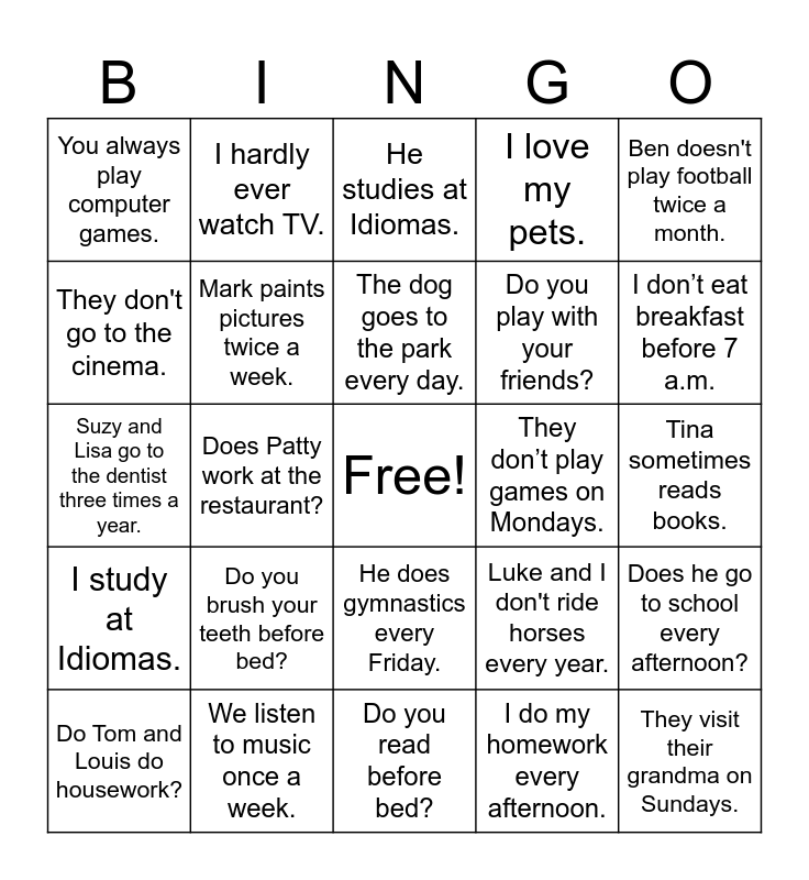 This bingo card has a free space and 26 words: He does gymnastics every Friday., I do my homework every afternoon., The dog goes to the park every day., We listen to music once a week., Ben doesn't play football twice a month., You always play computer games., They don't go to the cinema., I hardly ever watch TV., Tina sometimes reads books., Luke and I don't ride horses every year., Do you play with your friends?, Suzy and Lisa go to the dentist three times a year., Does he go to school every afternoon?, Do Tom and Louis do housework?, Does Patty work at the restaurant?, I don’t like pizza., I love my pets., I study at Idiomas., He studies at Idiomas., They visit their grandma on Sundays., I don’t eat breakfast before 7 a.m., Do you read before bed?, They don’t play games on Mondays., Do you brush your teeth before bed?, Mark paints pictures twice a week. and Kirk drinks lots of coffee every morning...