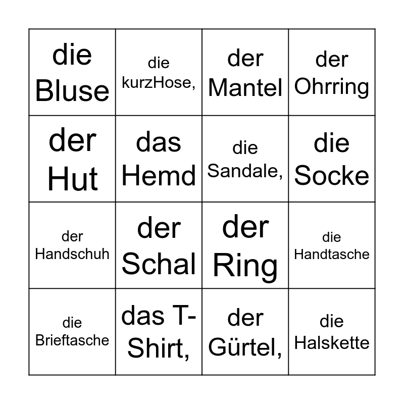 This bingo card has 24 words: der Rock,, die Hose, die Socke, die Schuhe, der Hut, die Bluse, das Hemd, die kurzHose,, das T-Shirt,, die Armbanduhr, der Handschuh, der Ring, die Brille, die Sonnenbrille, die Sandale,, das Kleid, der Gürtel,, der Mantel, der Schal, die Handtasche, die Brieftasche, die Halskette, der Ohrring and die Krawatte..