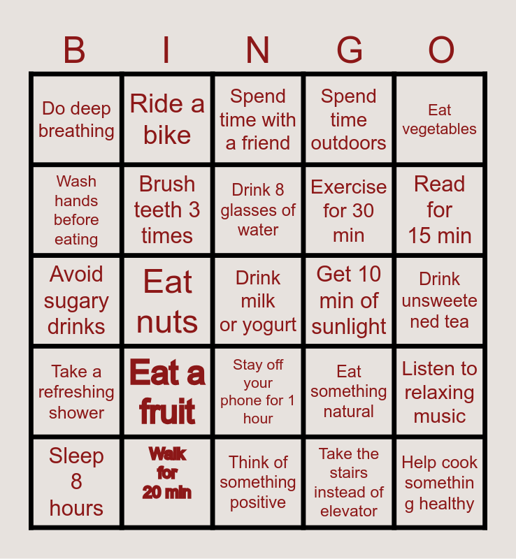 This bingo card has a free space and 24 words: Eat a fruit, Walk for 20 min, Drink 8 glasses of water, Sleep 8 hours, Eat vegetables, Do deep breathing, Wash hands before eating, Ride a bike, Get 10 min of sunlight, Stay off your phone for 1 hour, Exercise for 30 min, Avoid sugary drinks, Eat something natural, Listen to relaxing music, Brush teeth 3 times, Take the stairs instead of elevator, Drink unsweete ned tea, Spend time with a friend, Read for 15 min, Eat nuts, Help cook somethin g healthy, Take a refreshing shower, Spend time outdoors and Think of something positive.