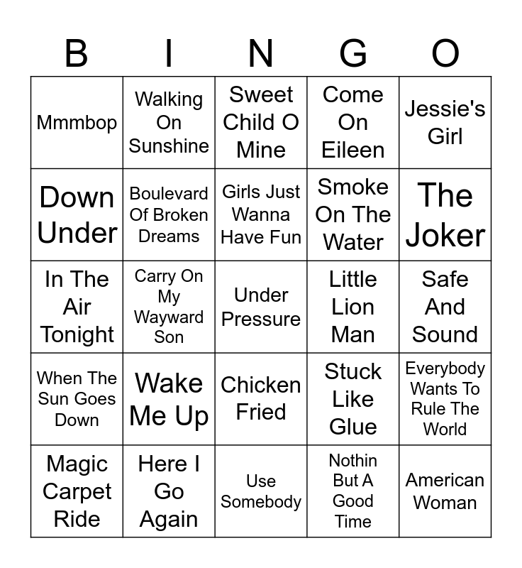 This bingo card has 35 words: 867-5309 Junny, Africa, Billie Jean, Boulevard Of Broken Dreams, Chicken Fried, Come On Eileen, Down Under, Float On, Girls Just Wanna Have Fun, I Wanna Dance With Somebody, In The Air Tonight, Jessie's Girl, Kiss, Kryptonite, Mmmbop, Little Lion Man, Nothin But A Good Time, Carry On My Wayward Son, When The Sun Goes Down, Under Pressure, Stuck Like Glue, Magic Carpet Ride, Everybody Wants To Rule The World, Here I Go Again, Sweet Child O Mine, The Joker, American Woman, Time After Time, Smoke On The Water, Safe And Sound, Take On Me, Use Somebody, Wake Me Up, Walking On Sunshine and Wonderwall.