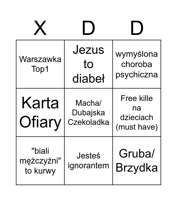 This bingo card has 9 words: "biali mężczyźni" to kurwy, wymyślona choroba psychiczna, Jezus to diabeł, Karta Ofiary, Warszawka Top1, Free kille na dzieciach (must have), Macha/ Dubajska Czekoladka, Gruba/ Brzydka and Jesteś ignorantem.