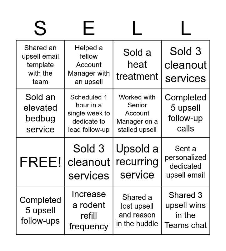 This bingo card has 19 words: Upsold a recurring service, Called a technician while on site to discuss an open lead, Sold a heat treatment, Shared 3 upsell wins in the Teams chat, Sent a personalized dedicated upsell email, Sold an elevated bedbug service, Shared a lost upsell and reason in the huddle, Shared an upsell email template with the team, Helped a fellow Account Manager with an upsell, FREE!, Sold 3 cleanout services, Scheduled 1 hour in a single week to dedicate to lead follow-up, Worked with Senior Account Manager on a stalled upsell, Increase a rodent refill frequency, Completed 5 upsell follow-ups, Schedule a call with a client to discuss a lead, Sold 3 cleanout services, Completed 5 upsell follow-up calls and Shared an upsell success story in the Teams chat.