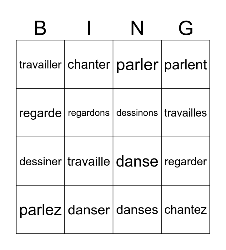 This bingo card has 16 words: danser, regarder, parler, travailler, dessiner, chanter, danse, danses, regarde, regardons, parlez, parlent, travaille, travailles, dessinons and chantez.