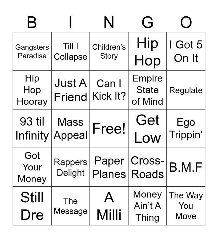 This bingo card has a free space and 24 words: Rappers Delight, The Message, Can I Kick It?, Still Dre, I Got 5 On It, Gangsters Paradise, Hip Hop Hooray, Till I Collapse, Get Low, Paper Planes, Empire State of Mind, 93 til Infinity, Cross-Roads, B.M.F, Just A Friend, Money Ain’t A Thing, Ego Trippin’, Children’s Story, Regulate, Mass Appeal, The Way You Move, Got Your Money, Hip Hop and A Milli.