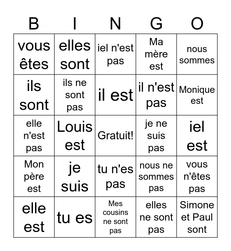 This bingo card has a free space and 24 words: je suis, tu es, il est, elle est, nous sommes, vous êtes, ils sont, elles sont, je ne suis pas, tu n'es pas, il n'est pas, elle n'est pas, nous ne sommes pas, vous n'êtes pas, ils ne sont pas, elles ne sont pas, iel est, iel n'est pas, Monique est, Louis est, Simone et Paul sont, Mon père est, Ma mère est and Mes cousins ne sont pas.