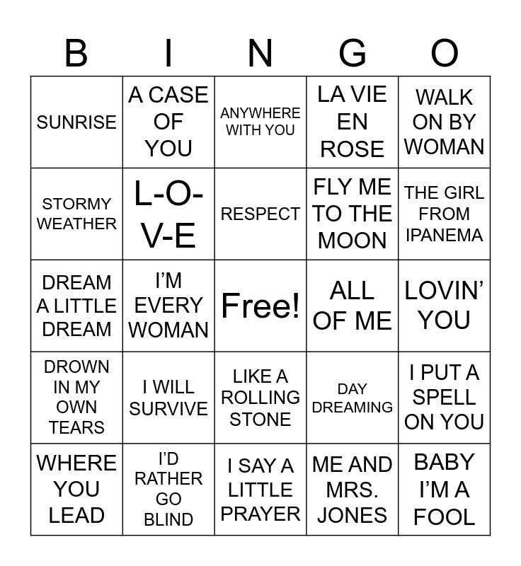 This bingo card has a free space and 56 words: FEVER, WHERE YOU LEAD, A SUNDAY KIND OF LOVE, SUNRISE, I SAY A LITTLE PRAYER, THIS WILL BE, L-O-V-E, YOU SEND ME, FLY ME TO THE MOON, I WISH I KNEW HOW IT WOULD FEEL, LA VIE EN ROSE, COME AWAY WITH ME, FEELING GOOD, I’LL BE SEEING YOU, ROLLING IN THE DEEP, CUPID, WALK ON BY WOMAN, I’M EVERY WOMAN, LOVE IS LETTING GO, BABY I’M A FOOL, ALL OF ME, WHAT’LL I DO, DAY DREAMING, ANYWHERE WITH YOU, GOOD MORNING HEARTACHE, RESPECT, HOW CAN YOU MEND, AT LAST, THE GIRL FROM IPANEMA, DON’T KNOW WHY, NEVER GONNA FIVE YOU UP, HOW DEEP IS YOUR LOVE, WHAT'S LOVE GOT TO DO WITH IT, LOVE IS A LOSING GAME, LOVIN’ YOU, STORMY WEATHER, DREAM A LITTLE DREAM, UMMM OH YEAH, DROWN IN MY OWN TEARS, A CASE OF YOU, LIKE A ROLLING STONE, THESE FOOLISH THINGS, KILLING ME SOFTLY, EASY, FIRST CHRISTMAS, I WILL SURVIVE, I’D RATHER GO BLIND, UNFORGETTABLE, YOU MAKE ME FEEL, YOU’RE ALL I NEED, ME AND MRS. JONES, CAN’T NOBODY LOVE YOU, LA BOHEME, FOOLS FALL IN LOVE, I PUT A SPELL ON YOU and CARNIVAL OF ANIMALS.
