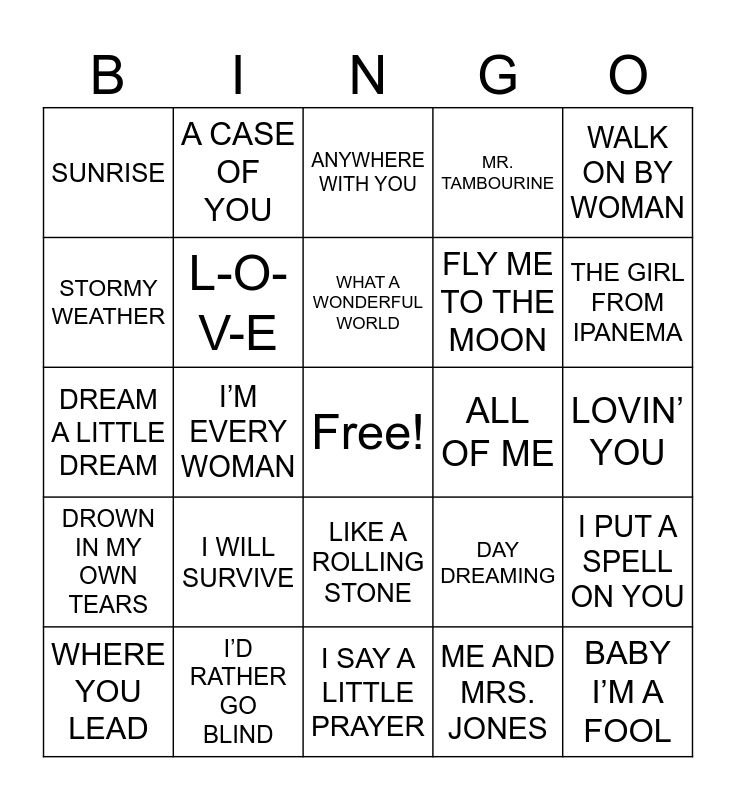 This bingo card has a free space and 56 words: FEVER, WHERE YOU LEAD, A SUNDAY KIND OF LOVE, SUNRISE, I SAY A LITTLE PRAYER, THIS WILL BE, L-O-V-E, YOU SEND ME, FLY ME TO THE MOON, I WISH I KNEW HOW IT WOULD FEEL, MR. TAMBOURINE, COME AWAY WITH ME, FEELING GOOD, I’LL BE SEEING YOU, ROLLING IN THE DEEP, CUPID, WALK ON BY WOMAN, I’M EVERY WOMAN, LOVE IS LETTING GO, BABY I’M A FOOL, ALL OF ME, WHAT’LL I DO, DAY DREAMING, ANYWHERE WITH YOU, GOOD MORNING HEARTACHE, WHAT A WONDERFUL WORLD, HOW CAN YOU MEND, AT LAST, THE GIRL FROM IPANEMA, DON’T KNOW WHY, NEVER GONNA FIVE YOU UP, HOW DEEP IS YOUR LOVE, WHAT'S LOVE GOT TO DO WITH IT, LOVE IS A LOSING GAME, LOVIN’ YOU, STORMY WEATHER, DREAM A LITTLE DREAM, UMMM OH YEAH, DROWN IN MY OWN TEARS, A CASE OF YOU, LIKE A ROLLING STONE, THESE FOOLISH THINGS, KILLING ME SOFTLY, EASY, FIRST CHRISTMAS, I WILL SURVIVE, I’D RATHER GO BLIND, UNFORGETTABLE, YOU MAKE ME FEEL, YOU’RE ALL I NEED, ME AND MRS. JONES, CAN’T NOBODY LOVE YOU, KNOCKIN ON HEAVEN'S DOOR, FOOLS FALL IN LOVE, I PUT A SPELL ON YOU and CARNIVAL OF ANIMALS.