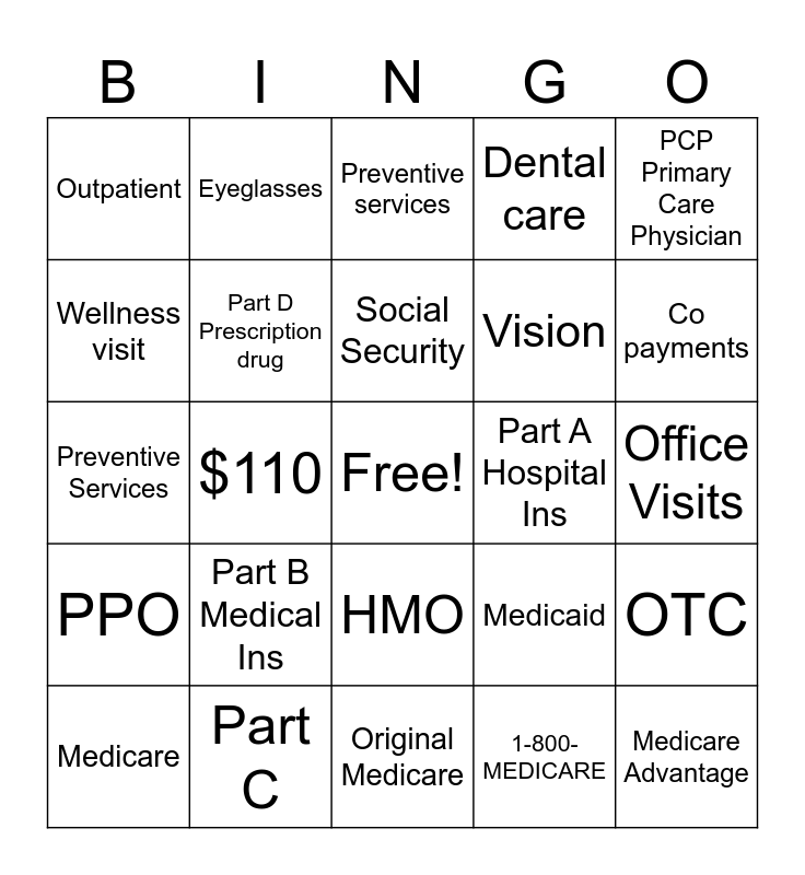 This bingo card has a free space and 29 words: Medicare, +$1500, $110, Home health care, Outpatient, Preventive services, Part D Prescription drug, Part B Medical Ins, Part A Hospital Ins, Part C, Office Visits, Medicare Advantage, Original Medicare, 1-800-MEDICARE, Co payments, Hearing aids, HMO, PPO, PCP Primary Care Physician, Preventive Services, Medicaid, Open Enrollment, Vision, Wellness visit, Dental care, Eyeglasses, OTC, Social Security and Long-term care.