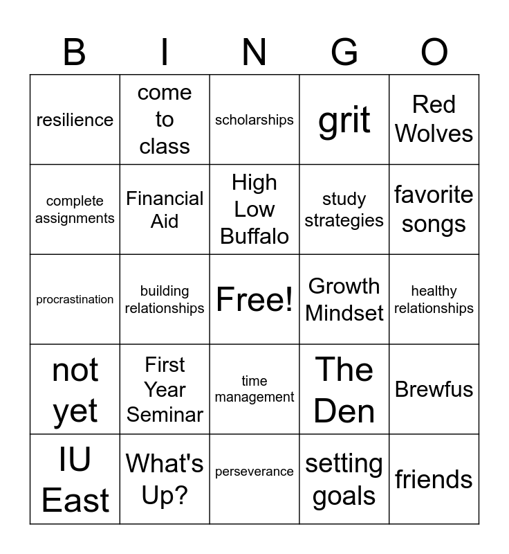 This bingo card has a free space and 24 words: First Year Seminar, What's Up?, High Low Buffalo, IU East, Red Wolves, resilience, complete assignments, come to class, Growth Mindset, time management, study strategies, procrastination, The Den, Brewfus, Financial Aid, setting goals, healthy relationships, scholarships, favorite songs, building relationships, friends, not yet, grit and perseverance.