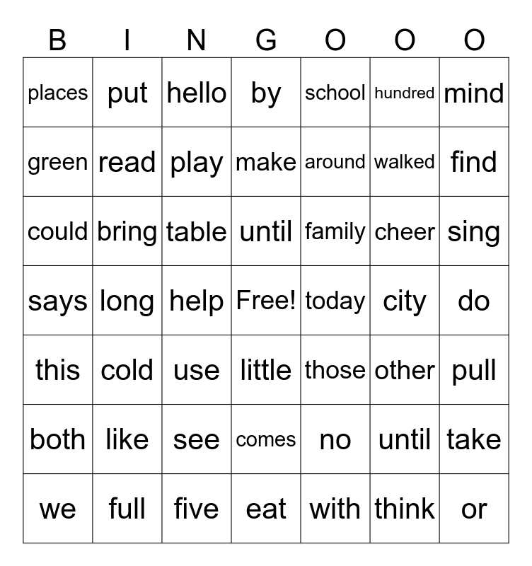 This bingo card has a free space and 50 words: take, walked, think, long, table, little, put, eat, hundred, those, mind, by, cheer, family, see, do, green, find, we, school, around, help, places, read, full, or, play, five, hello, until, children, this, like, comes, says, city, other, pull, both, could, use, no, cold, with, sing, make, today, until, bring and no.