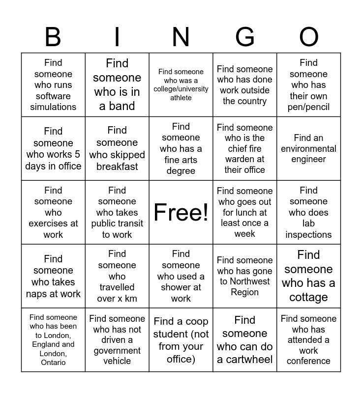 This bingo card has a free space and 32 words: Find someone who can do a cartwheel, Find someone who has been to the Big Apple in Colborne, ON, Find someone who takes public transit to work, Find someone who bikes to work, Find someone who takes naps at work, Find someone who skipped breakfast, Find someone who has their own pen/pencil, Find someone who has a cottage, Find someone who is in a band, Find someone who gardens, Find someone who has a fine arts degree, Find someone who was a college/university athlete, Find someone who has their pet as their wallpaper, Find someone who used dial up internet, Find someone who goes out for lunch at least once a week, Find someone who takes ride share to work, Find someone who has been to London, England and London, Ontario, Find someone who exercises at work, Find someone who used a shower at work, Find someone who travelled over x km, Find someone who has gone to Northwest Region, Find someone who has worked on a culvert, Find someone who does lab inspections, Find someone who has not driven a government vehicle, Find someone who has attended a work conference, Find someone who has done work outside the country, Find someone who is the chief fire warden at their office, Find someone who works 5 days in office, Find someone who runs software simulations, Find a coop student (not from your office), Find a manager (not from your office) and Find an environmental engineer.