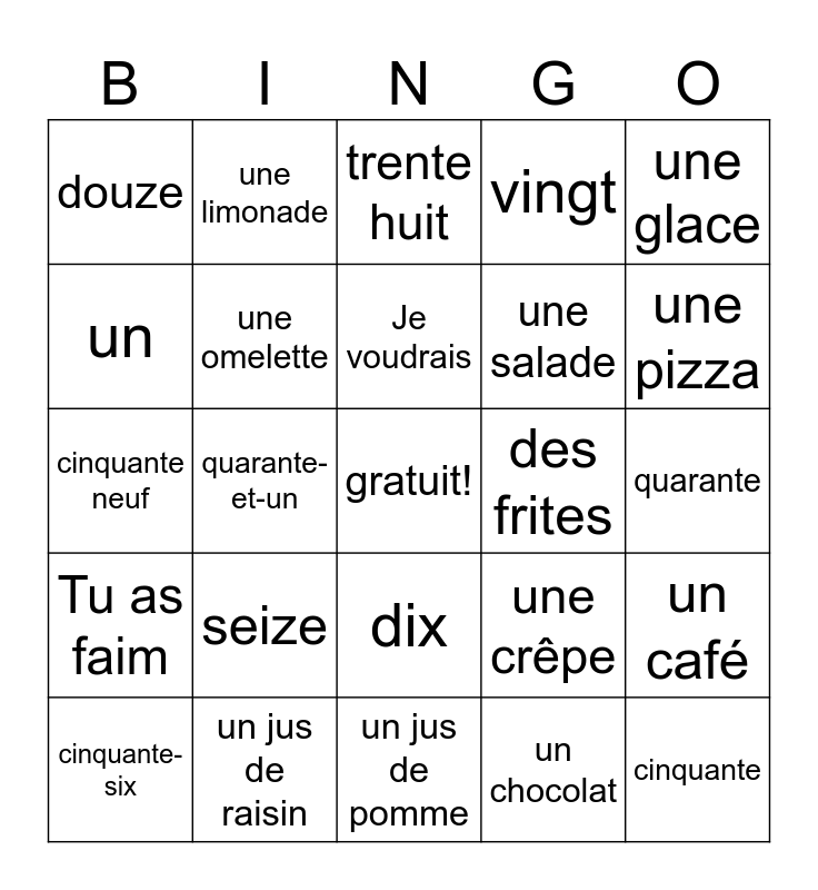 This bingo card has a free space and 24 words: seize, un jus de raisin, Je voudrais, cinquante-six, une glace, douze, un, une limonade, des frites, dix, une salade, cinquante neuf, une crêpe, un café, une omelette, un chocolat, quarante, trente huit, une pizza, quarante-et-un, cinquante, Tu as faim, vingt and un jus de pomme.