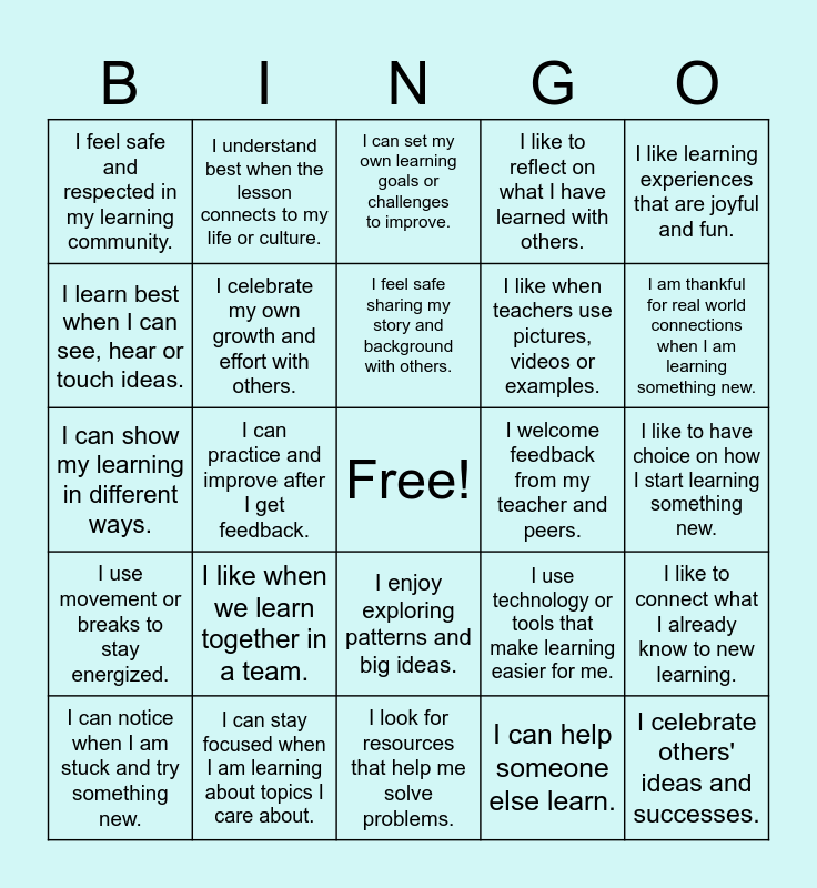 This bingo card has a free space and 24 words: I like when we learn together in a team., I can stay focused when I am learning about topics I care about., I feel safe sharing my story and background with others., I can notice when I am stuck and try something new., I like learning experiences that are joyful and fun., I feel safe and respected in my learning community., I learn best when I can see, hear or touch ideas., I understand best when the lesson connects to my life or culture., I welcome feedback from my teacher and peers., I enjoy exploring patterns and big ideas., I like when teachers use pictures, videos or examples., I can show my learning in different ways., I use technology or tools that make learning easier for me., I like to connect what I already know to new learning., I celebrate my own growth and effort with others., I can help someone else learn., I like to have choice on how I start learning something new., I can set my own learning goals or challenges to improve., I am thankful for real world connections when I am learning something new., I can practice and improve after I get feedback., I celebrate others' ideas and successes., I use movement or breaks to stay energized., I like to reflect on what I have learned with others. and I look for resources that help me solve problems..