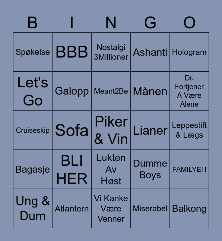 This bingo card has 27 words: Dumme Boys, Balkong, Månen, Vi Kanke Være Venner, Let's Go, Nostalgi 3Millioner, BBB, Bagasje, Lianer, FAMILYEH, Cruiseskip, Ashanti, Ung & Dum, Atlantern, Du Fortjener Å Være Alene, Hvis Du Vil, Galopp, Meant2Be, BLI HER, Spøkelse, Leppestift & Lægs, Miserabel, Sofa, Piker & Vin, Lukten Av Høst, Hologram and La Meg Gå.