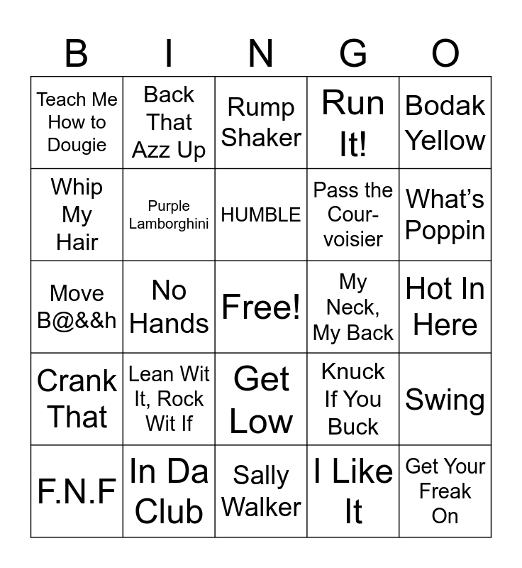 This bingo card has a free space and 24 words: Lean Wit It, Rock Wit If, In Da Club, HUMBLE, F.N.F, Bodak Yellow, Teach Me How to Dougie, Whip My Hair, Back That Azz Up, My Neck, My Back, Get Low, Pass the Cour-voisier, Move B@&&h, Knuck If You Buck, Swing, Purple Lamborghini, I Like It, Hot In Here, Rump Shaker, What’s Poppin, No Hands, Get Your Freak On, Crank That, Run It! and Sally Walker.