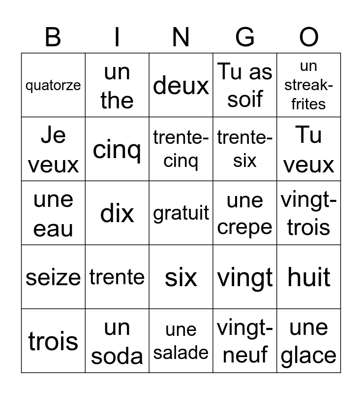 This bingo card has a free space and 24 words: trente, un soda, trente-cinq, trois, un streak-frites, quatorze, Je veux, un the, une crepe, six, trente-six, une eau, vingt, huit, cinq, vingt-neuf, vingt-trois, deux, Tu veux, dix, une glace, seize, Tu as soif and une salade.