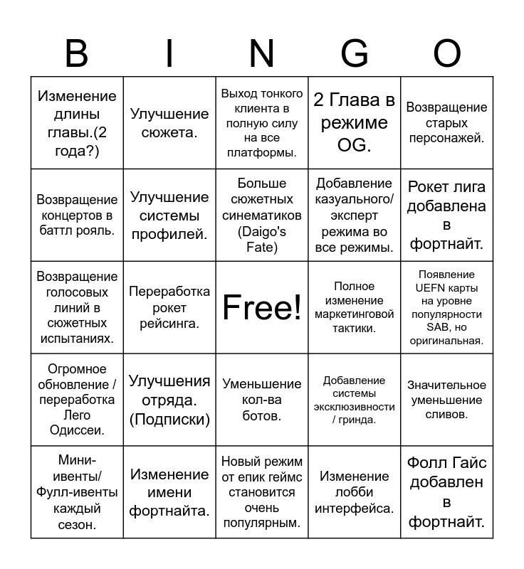 This bingo card has a free space and 24 words: Улучшения отряда.(Подписки), Изменение имени фортнайта., Больше сюжетных синематиков (Daigo's Fate), Мини-ивенты/Фулл-ивенты каждый сезон., Возвращение старых персонажей., Изменение длины главы.(2 года?), Возвращение концертов в баттл рояль., Улучшение сюжета., Полное изменение маркетинговой тактики., Уменьшение кол-ва ботов., Добавление казуального/эксперт режима во все режимы., Возвращение голосовых линий в сюжетных испытаниях., Добавление системы эксклюзивности / гринда., Значительное уменьшение сливов., Улучшение системы профилей., Изменение лобби интерфейса., Появление UEFN карты на уровне популярности SAB, но оригинальная., Выход тонкого клиента в полную силу на все платформы., Рокет лига добавлена в фортнайт., Переработка рокет рейсинга., Фолл Гайс добавлен в фортнайт., Огромное обновление / переработка Лего Одиссеи., 2 Глава в режиме OG. and Новый режим от епик геймс становится очень популярным..