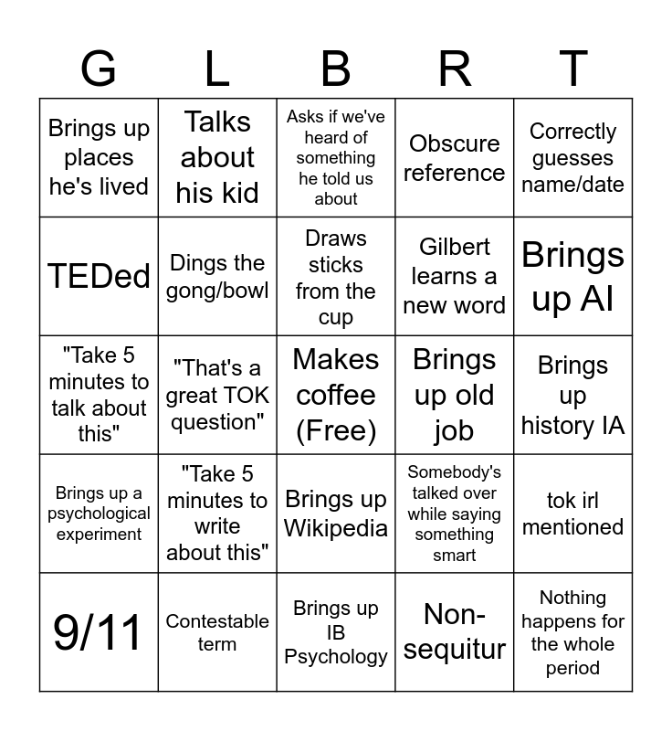 This bingo card has a free space and 33 words: Makes coffee twice, Tangent becomes lesson, "That's a great TOK question", Asks the same question until he gets the right answer, Brings up a psychological experiment, Dings the gong/bowl, Correctly guesses name/date, 9/11, Talks about his kid, Noticeable accent moment (encompass), Draws sticks from the cup, Asks if we've heard of something he told us about, Brings up a podcast, Gilberts mom/"real history", Brings up old job, Brings up AI, Contestable term, "Take 5 minutes to talk about this", "Take 5 minutes to write about this", Somebody's talked over while saying something smart, Brings up Wikipedia, Gets mad at America, Brings up places he's lived, Brings up history IA, Brings up IB Psychology, Nothing happens for the whole period, Obscure reference, Gilbert learns a new word, TEDed, tok irl mentioned, CAS mentioned, Non-sequitur and Theoretical Concept.