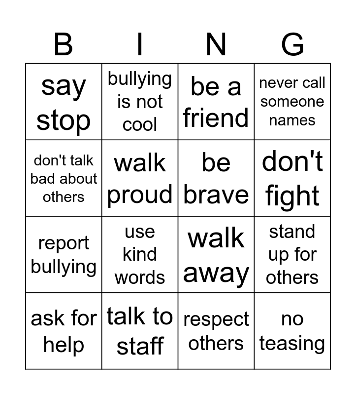 This bingo card has 16 words: ask for help, talk to staff, be a friend, never call someone names, don't talk bad about others, bullying is not cool, walk away, stand up for others, say stop, walk proud, respect others, don't fight, report bullying, use kind words, be brave and no teasing.