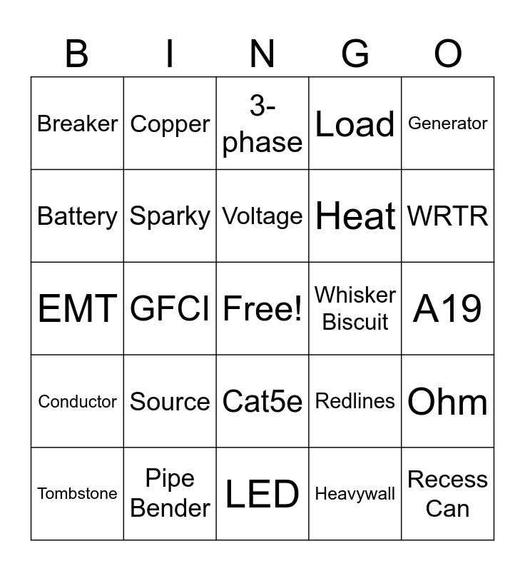 This bingo card has a free space and 64 words: Romex, Wire Nut, Short Circuit, Ohm, Neutral, Amp, Copper, Wire strippers, Voltage, Insulator, Cat5e, Ground, A19, Generator, Volt, Battery, GFCI, Breaker, Switch, Heat, Source, Conductor, Load, Transformer, Bonding, Panel, T-stat, Conduit, Outlet, Flex, Kilowatt, Fixture, NEC, Raintight, WRTR, Tombstone, Cover Plate, Heavywall, Bell Box, Sparky, EMT, Whisker Biscuit, Apprentice, Journeyman, Master, Recess Can, Pipe Bender, One-Line, Redlines, AFCI, Ammeter, Feeder, LED, HomeWorks, Riser, Single Phase, 3-phase, Watt, 3-way, Strut, Splice, Surge Protection, Fuse and Direct Burial.
