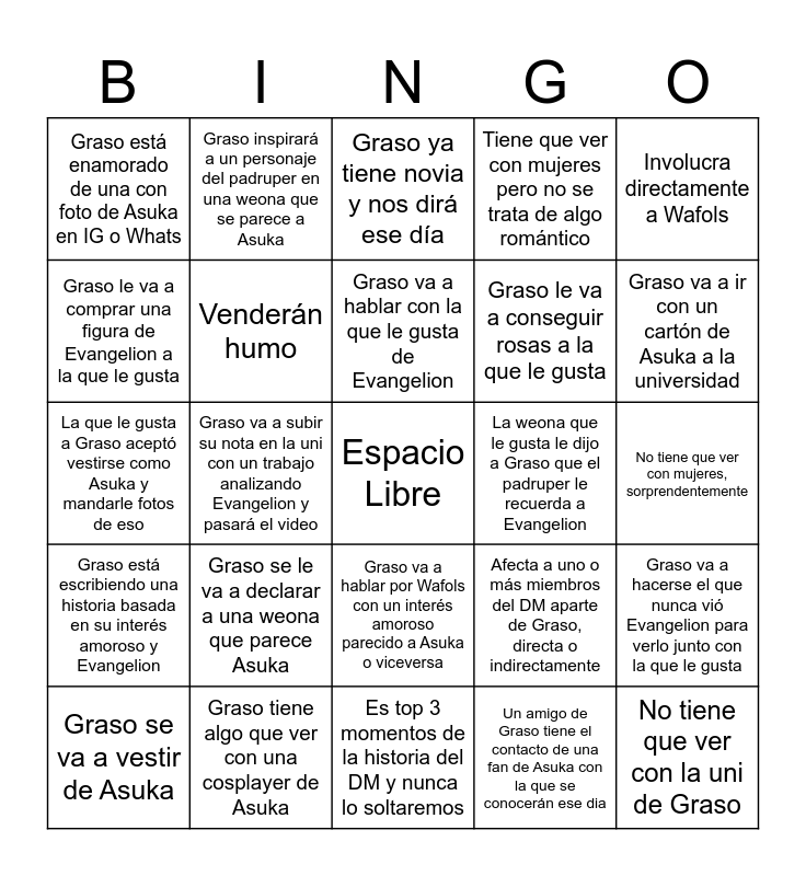 This bingo card has a free space and 24 words: Graso se le va a declarar a una weona que parece Asuka, Graso tiene algo que ver con una cosplayer de Asuka, Graso va a hablar con la que le gusta de Evangelion, Graso se va a vestir de Asuka, Involucra directamente a Wafols, Graso está enamorado de una con foto de Asuka en IG o Whats, Graso le va a comprar una figura de Evangelion a la que le gusta, Graso inspirará a un personaje del padruper en una weona que se parece a Asuka, La weona que le gusta le dijo a Graso que el padruper le recuerda a Evangelion, Graso va a hablar por Wafols con un interés amoroso parecido a Asuka o viceversa, Graso le va a conseguir rosas a la que le gusta, La que le gusta a Graso aceptó vestirse como Asuka y mandarle fotos de eso, Afecta a uno o más miembros del DM aparte de Graso, directa o indirectamente, Graso va a hacerse el que nunca vió Evangelion para verlo junto con la que le gusta, Venderán humo, Un amigo de Graso tiene el contacto de una fan de Asuka con la que se conocerán ese dia, No tiene que ver con mujeres, sorprendentemente, Graso ya tiene novia y nos dirá ese día, Graso va a ir con un cartón de Asuka a la universidad, Graso va a subir su nota en la uni con un trabajo analizando Evangelion y pasará el video, No tiene que ver con la uni de Graso, Graso está escribiendo una historia basada en su interés amoroso y Evangelion, Tiene que ver con mujeres pero no se trata de algo romántico and Es top 3 momentos de la historia del DM y nunca lo soltaremos.