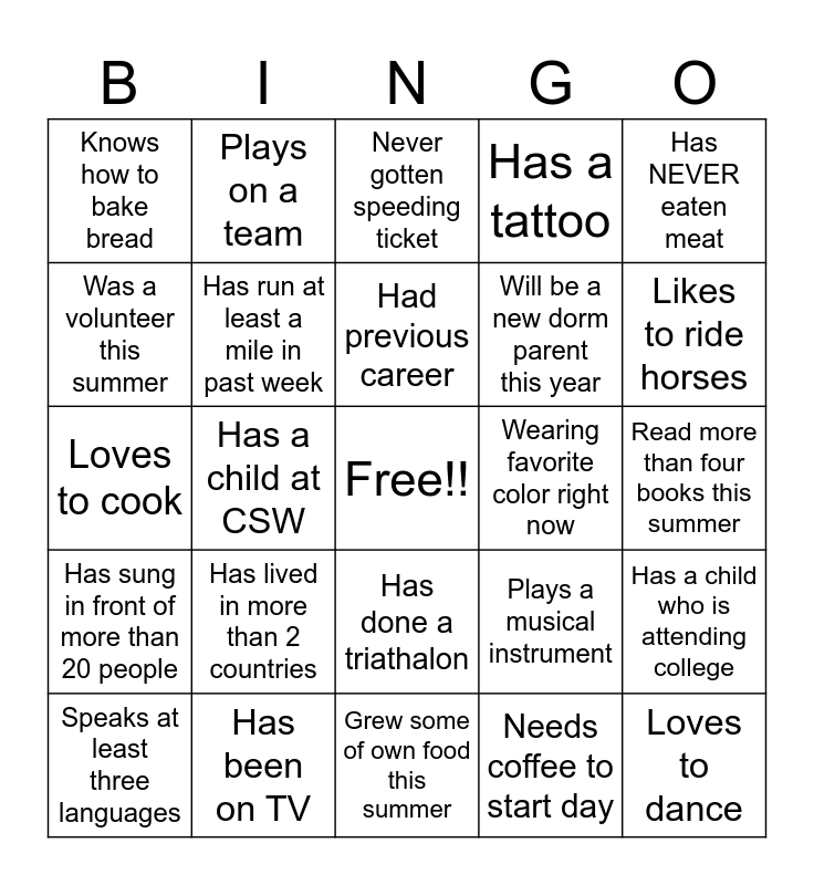 This bingo card has a free space and 34 words: Has dog on campus, Needs coffee to start day, Is a night owl, Reads true crime books, Has sung in front of more than 20 people, Has run at least a mile in past week, Has NEVER eaten meat, Speaks at least three languages, Plays on a team, Worked at another school, Had previous career, Never gotten speeding ticket, Never had a cavity, Flown in hot air balloon, Wearing favorite color right now, Likes to ride horses, Has been on TV, Loves to cook, Has lived in more than 2 countries, Plays a musical instrument, Has done a triathalon, Has more than one pet, Knows how to bake bread, Read more than four books this summer, Grew some of own food this summer, Loves to dance, Has a tattoo, Moved this summer, Will be a new dorm parent this year, Was a volunteer this summer, Attended a workshop, Has a child at CSW, Has a child who is attending college and Is taking on a new role at CSW.